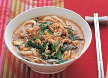4・別の鍋にたっぷりの湯を沸かし、うどんを入れてサッとゆで、ざるに上げて水けをきる。器に盛り、3を注ぐ。