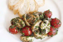 1・マッシュルームは石づきを取って2〜4等分に切る。
