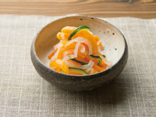 ◆材料(作りやすい分量) 柿……1/2個 みりん……大さじ1 ダイコン……200g ニンジン……100g 塩……少々 (A)水……1/2カップ 砂糖……大さじ2 酢……大さじ2と2/3 塩……小さじ2
