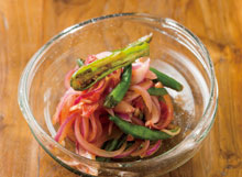 ◆材料(2人分) シシトウ…・・・6本 紫タマネギ……1/2個 ショウガ(薄切り)……3枚 トマト……1/4個 (A)カイエンペッパー・・・…小さじ1/5 レモン汁……大さじ1 塩……小さじ1/4