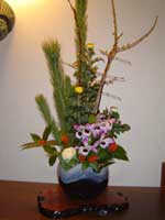”松”や”千両”などお正月花の定番に、洋花をうまくアレンジするのが橋本流…。リーズナブルなお値段(¥3000)も好評で、「毎年来てほしい。」とうれしいリクエストをいただきました。