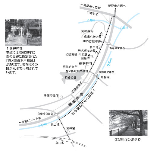 | 爽やかな五月の風に誘われて『歴史と文化の散歩道』を歩いてみました。永山駅より右手に消防署を見ながらスタート。乞田川で川に沿って右に曲がります。緑のトンネルを、川のせせらぎや鳥の声を聴きながら熊野橋に向います。お散歩しているご夫婦、ワンちゃんとランニング中のおじさん、いろいろな人とすれ違うのもなぜか楽しい。熊野橋で鎌倉街道を横切り熊野神社へ。人気の無い神社の奥は木々が生い茂りまさにパワースポット。参道には、鎌倉街道に設置された関所『霞ノ関南木戸柵跡』があります。聖蹟桜ヶ丘に向かう、旧鎌倉街道沿いにはお寺や無名戦士の墓、庚申塔などがあり、見回すと所々に昔の多摩と鎌倉街道の面影が残っています。 | |||||||||||||||||||||||||||||||||||||||||||||||||||||||||